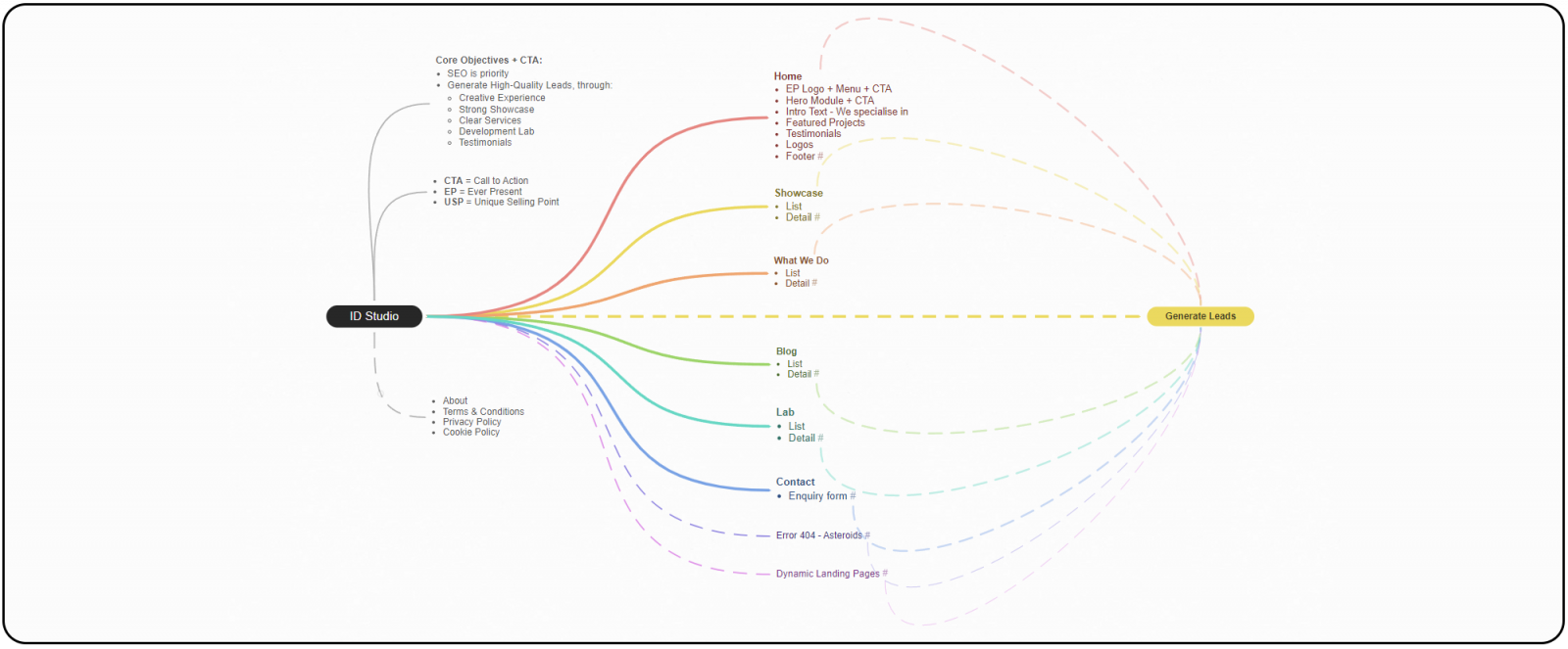 Our first task in planning out a project is to put together the sitemap and the core objectives. We use a program called Coggle to accomplish this. Coggle is a collaborative mind mapping tool that helps us to visualise the site structure. We’ll also list any 3rd party integrations for the project and visually display where each integration interacts with the site. We’ll show which pages will drive the core objectives. For example, if the main core objective of the site is lead generation then we would show how the homepage, contact page and services pages would achieve this objective through call to action triggers.