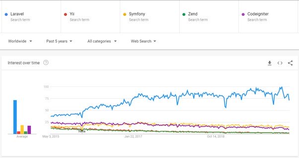 Laravel is currently the top starred PHP repository on GitHub, search interest in Laravel has increased steadily year on year (graph below from Google Trends for the last five years):