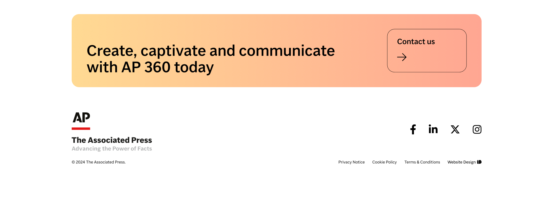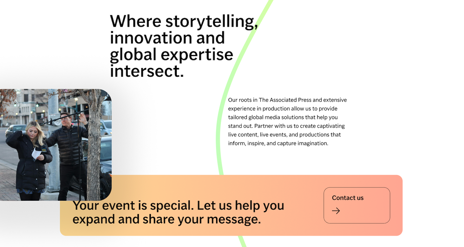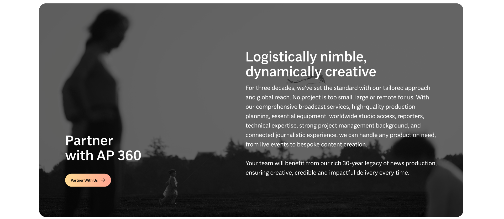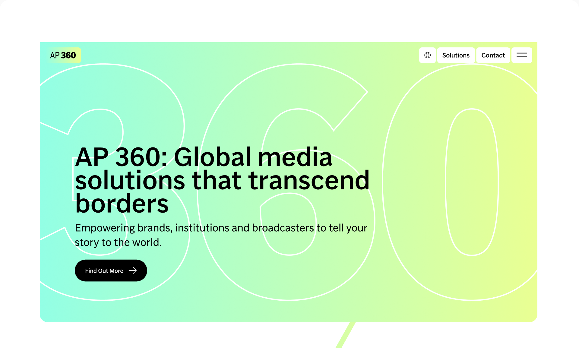 AP 360 offers global media solutions that transcend borders, they empowering brands, institutions and broadcasters to tell their stories to the world. Their roots in The Associated Press and extensive experience in production allow them to provide tailored global media solutions that help their clients stand out. Partner with AP 360 to create captivating content, live events and productions that inform, inspire and capture imagination.
