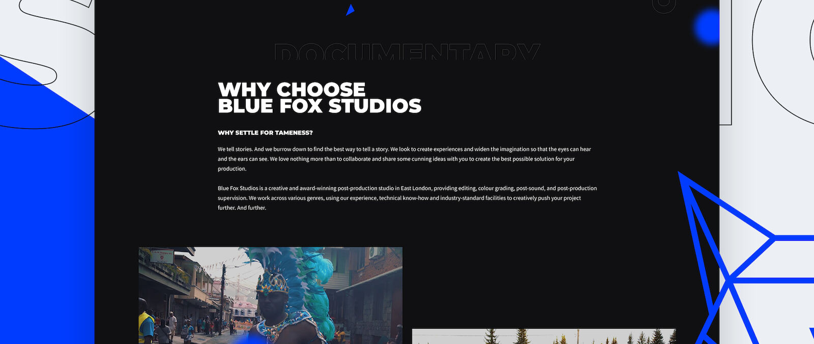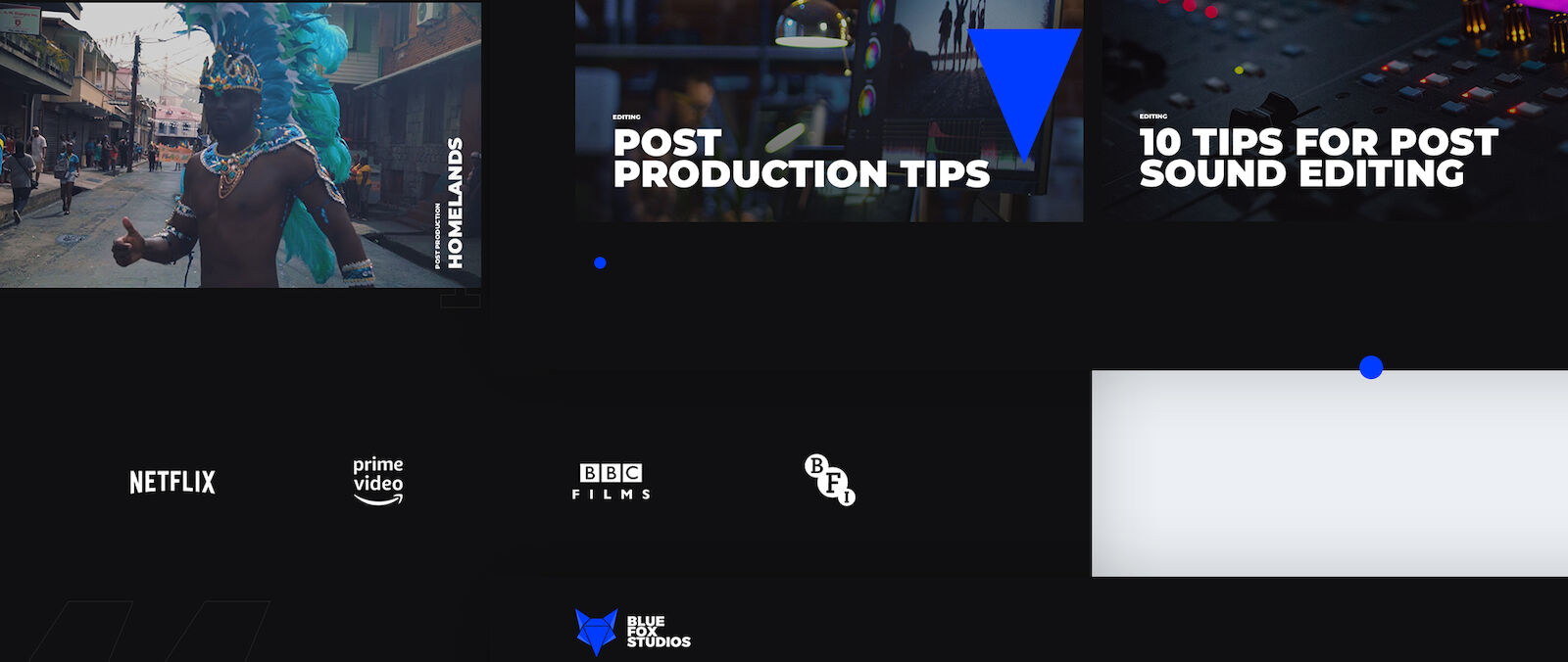 When it comes to creative and award-winning post-production studios, why settle for tame? Blue Fox Studios is based in East London, providing editing, colour grading, post-sound, and post-production supervision. Our job was to give Blue Fox Studios a fresh new brand upgrade and a modern website experience, so we focussed on conceptual design, incorporating Three.JS to achieve some memorable brand imprints.