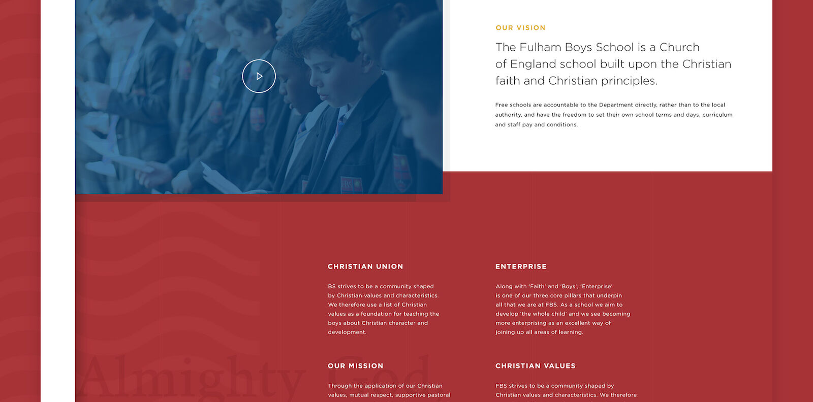 Fulham Boys School. Thier pledge, and unflinching resolve, is to be one of the best schools in the UK - state or private in the next ten years. To achieve this they have created and constantly reinforced a very distinctive ethos. It is an ethos that is built upon the Christian faith, nurtures enterprise and is geared towards boys.