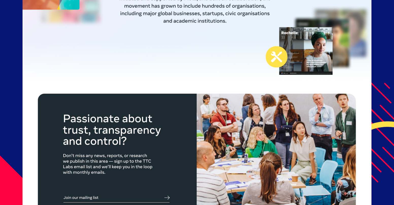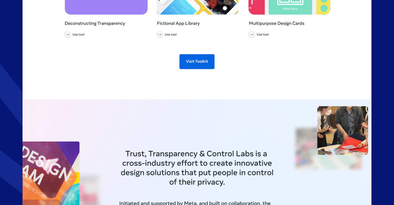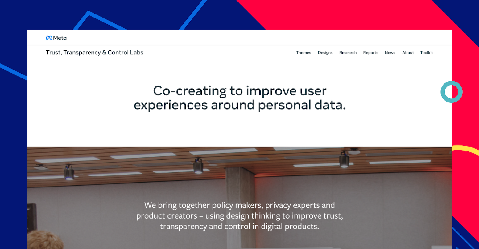 Meta TTC Labs brings together policy makers, privacy experts and product creators – using design thinking to improve trust, transparency and control in digital products. The Trust, Transparency and Contol Labs is a cross-industry effort to create innovative design solutions that put people in control of their privacy