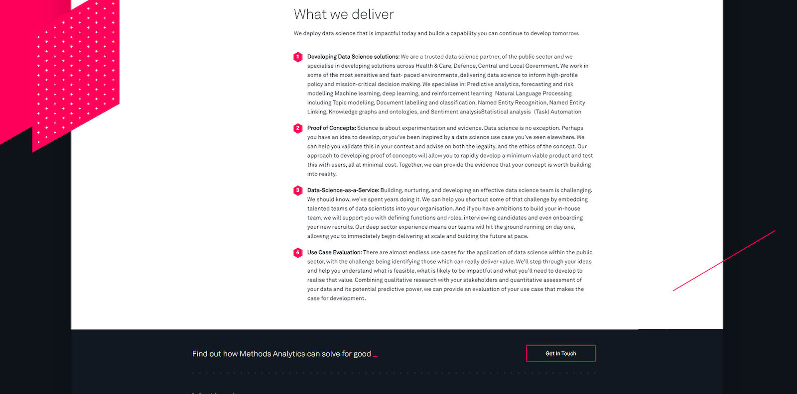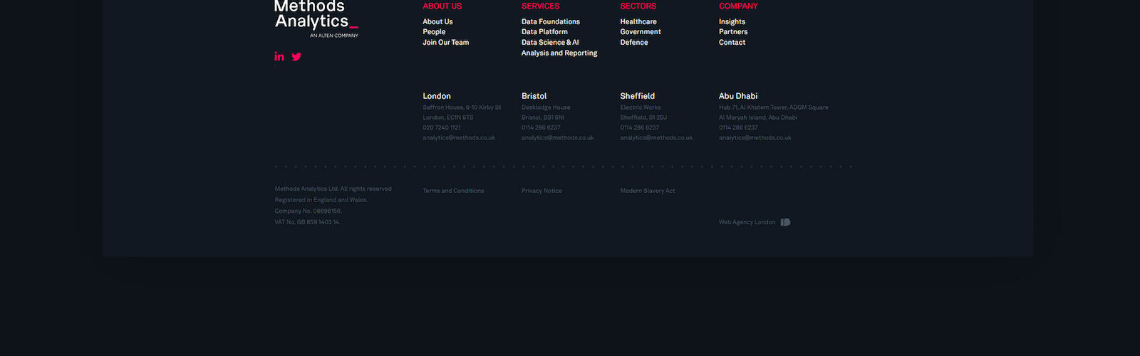 Methods Analytics are a dedicated and specialist team of data solvers. Founded in 2013, they have evolved to help public and private sector clients solve complex problems and do good things. From problem identification, data management and data science, to visualisation, interpretation and the delivery of actionable intelligence – MA offer solutions across the entire data lifecycle.