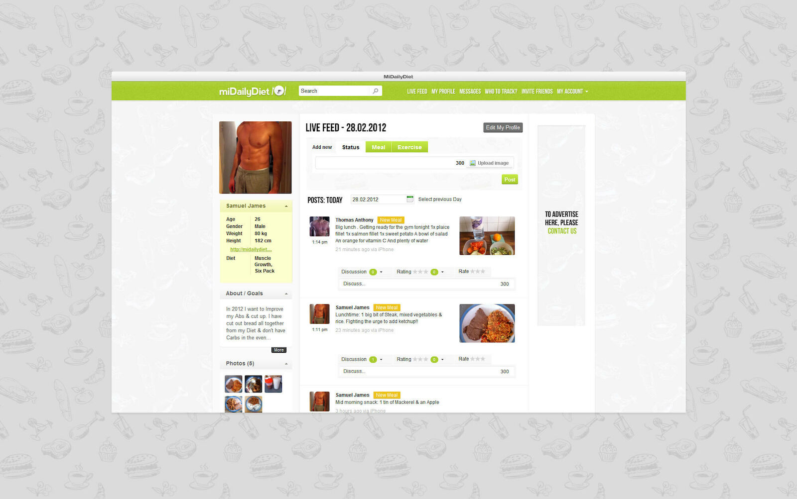 miDailyDiet is a FREE live social network for anyone aged sixteen (16) & over which connects you to the latest information regarding people’s diets & fitness. Simply find & Track the Diet(s) / Fitness genre(s) that most suits your lifestyle & goals. Users can Post daily information regarding a Status, Meal, Exercise & Photos. Each Post can be up to 300 characters long & connected to each update is the option to upload a picture for that Post. Posts are displayed by day & users can select to view all posts made each day in a Live Feed or on user’s Profiles. You can share your lifestyle within your Posts, or simply give tips to your Diet Trackers.
