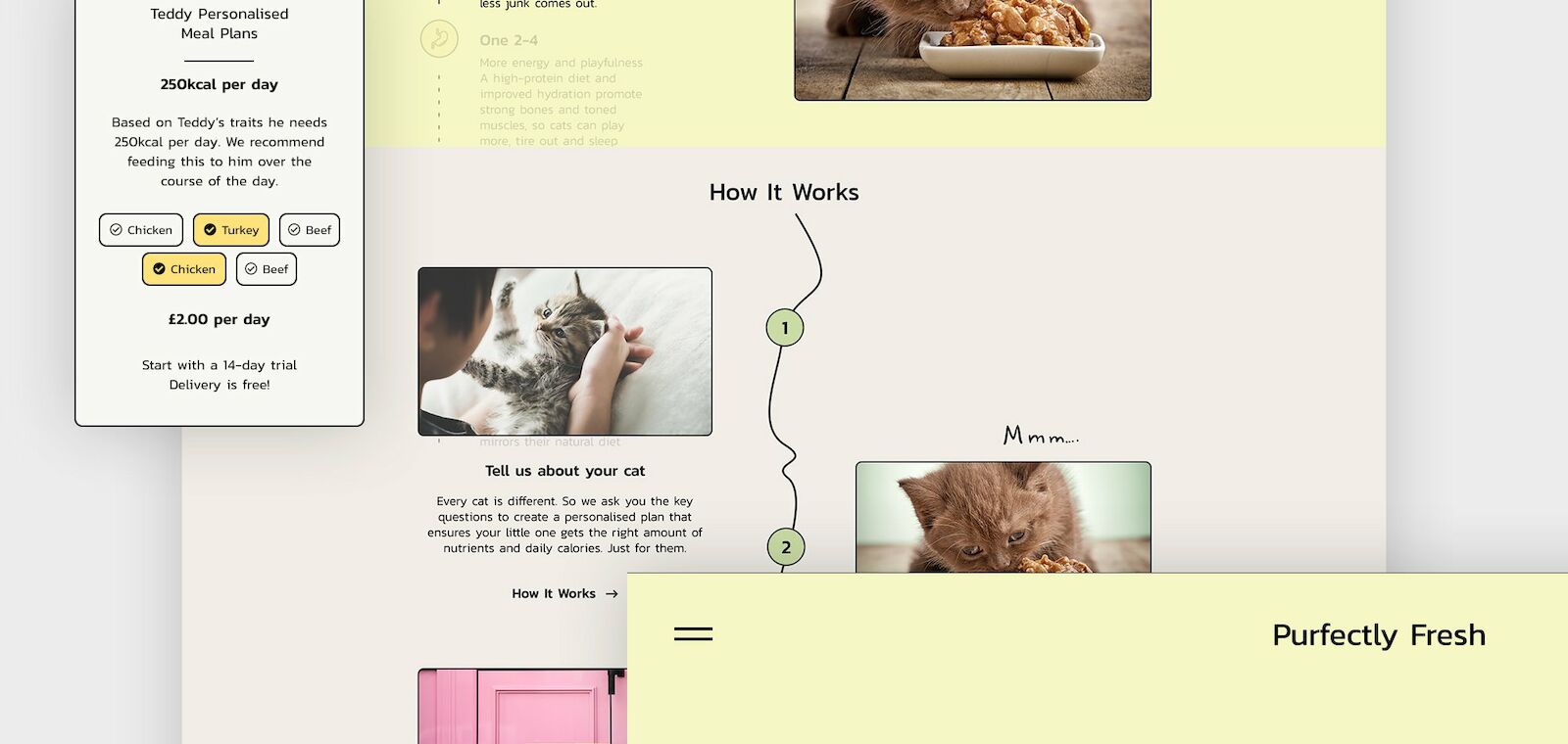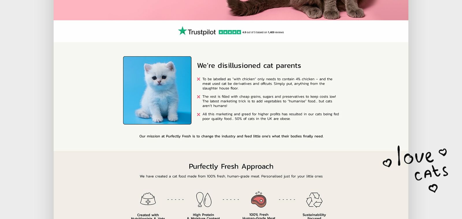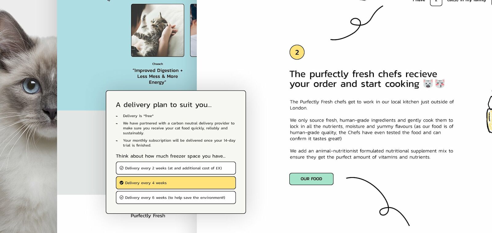 Fresh, real food. For cats. The UK’s first personalised cat food made from only fresh, real meat. Purfectly fresh are cat people who grew tired of commercial cat food brands advertising junk food as healthy food for cats. So they created a cat food brand that makes sense specifically for each cats unique nutritional and biological needs.