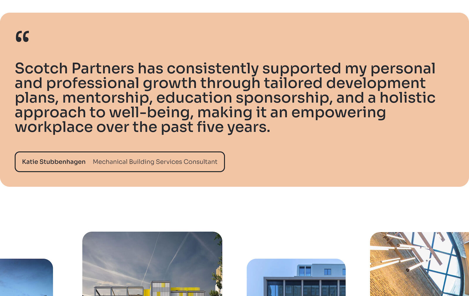 Scotch Partners are MEP, Sustainability, and Acoustics Consulting Engineers. Scotch Partners are committed to delivering high-quality, high-performing buildings for a better, more sustainable future. Their expertise in mechanical, electrical & public health (MEP), sustainability, acoustics, and building physics enables them to deliver progressive and sustainable design solutions for the built environment.