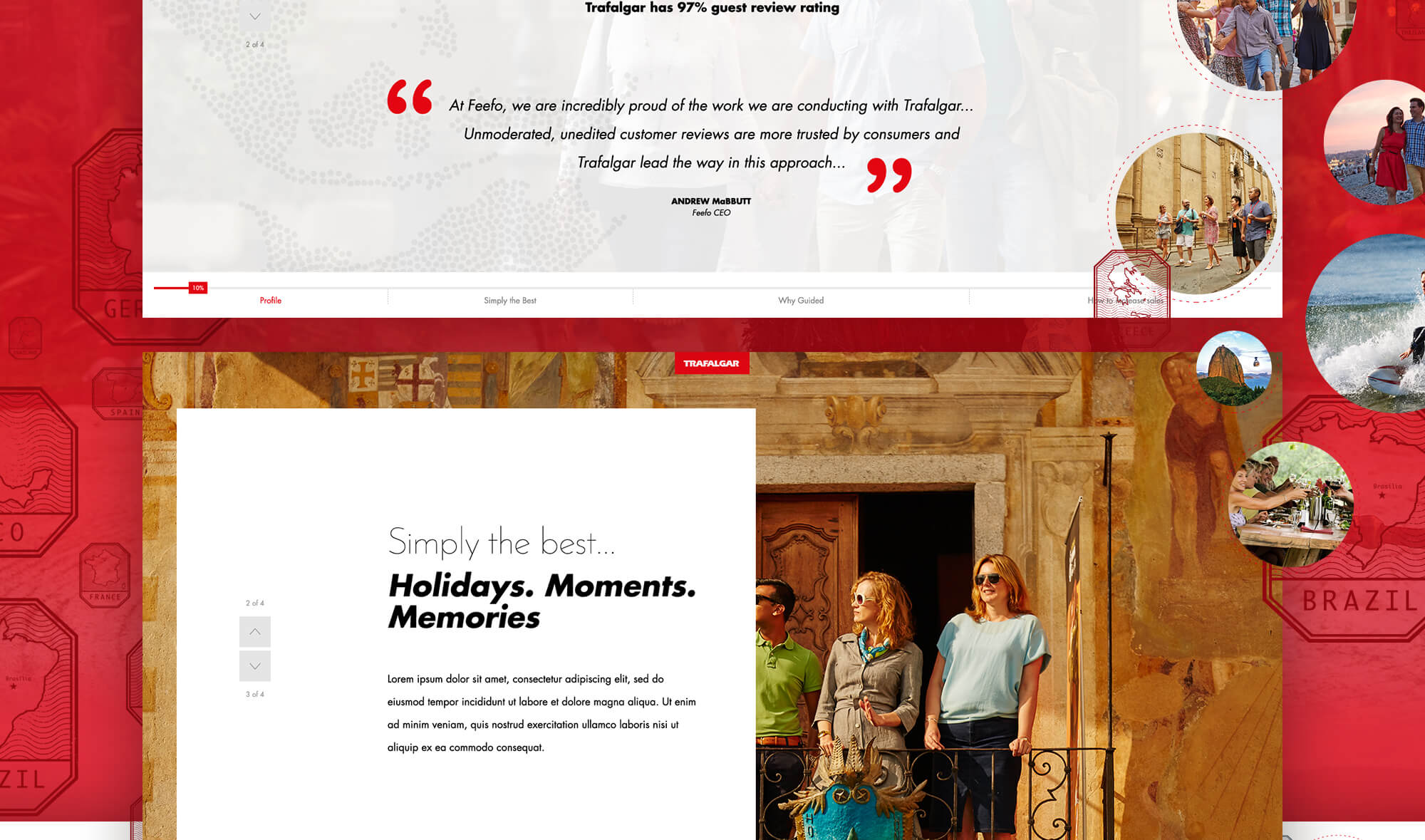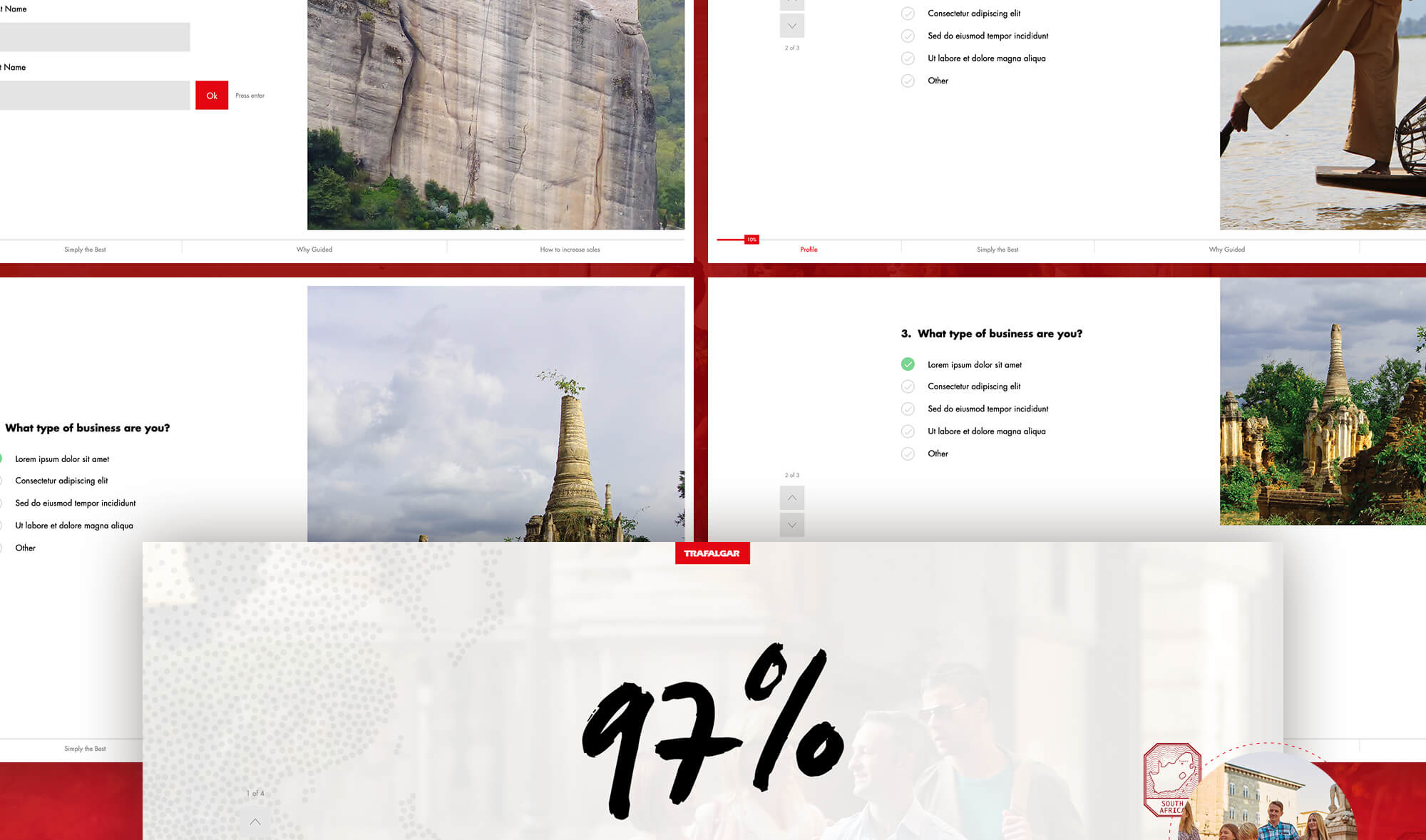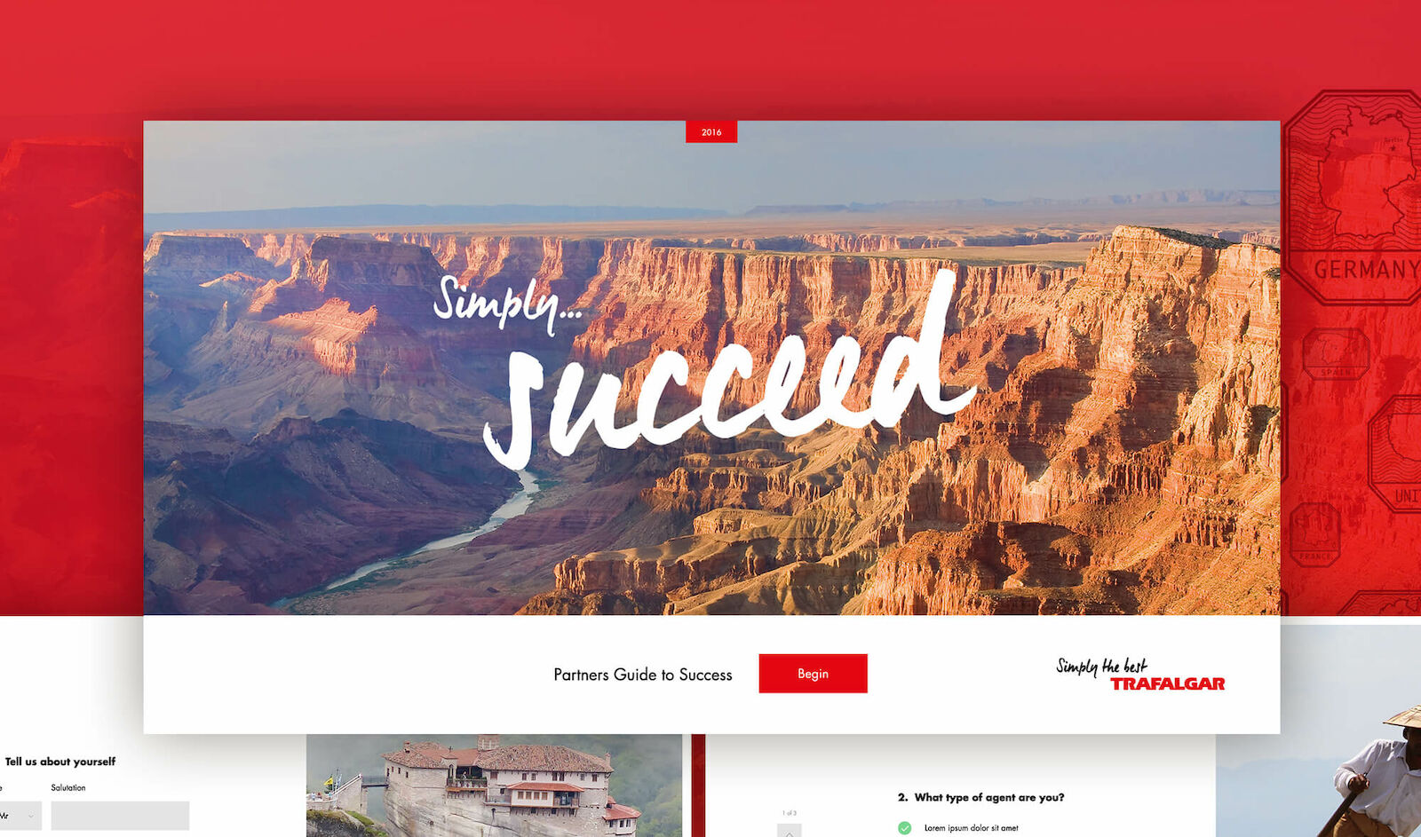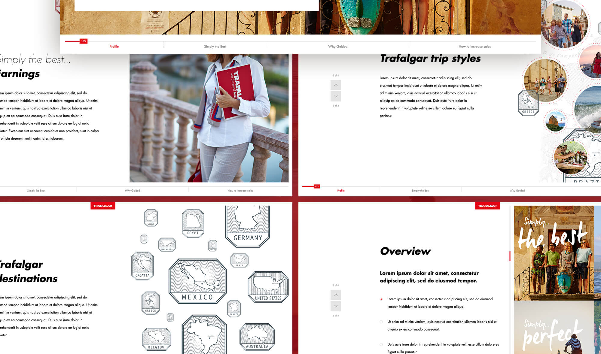 A beautifully modern e-learning system design and developed for London based Trafalgar. Trafalgar is a company that provides an exceptionally high standard of guided tours around the world, with over 70 years experience. The training platform is designed to provide agents with a clean modern interface, presenting the core Trafalgar message, ethos and brand.